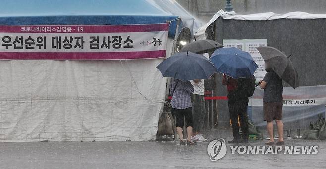 빗속 코로나19 검사 대기