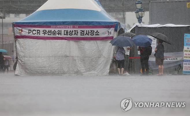 빗속 코로나19 검사 대기