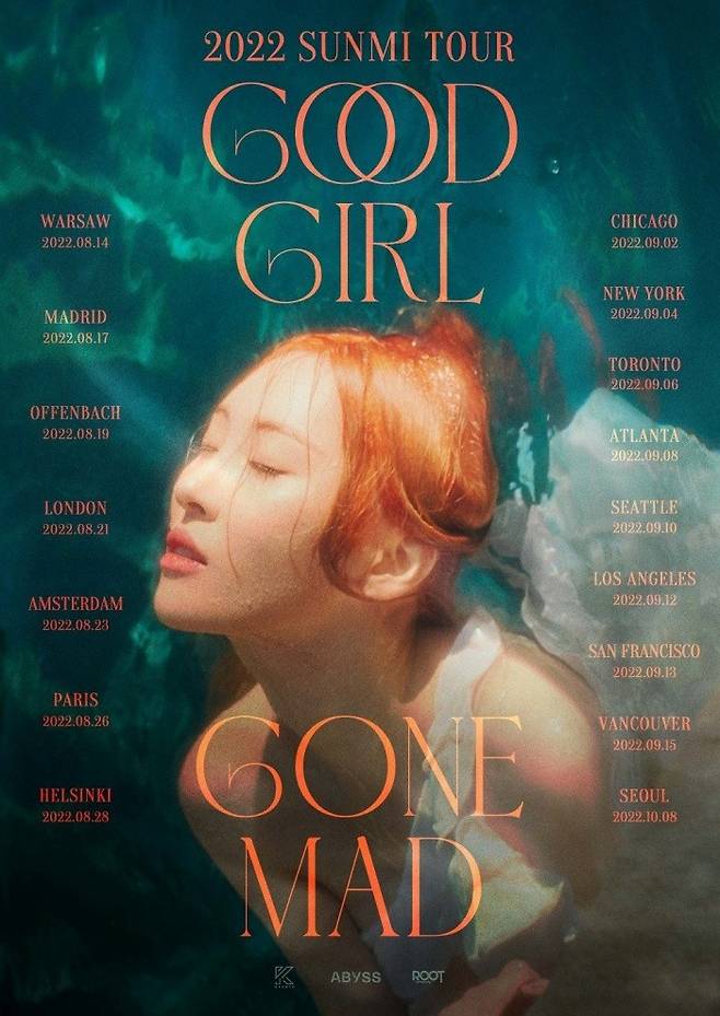 선미 소속사 어비스컴퍼니는 지난 29일 공식 SNS 채널을 통해 선미의 월드투어 '2022 SUNMI TOUR 'GOOD GIRL GONE MAD'' 개최 소식을 알렸다.