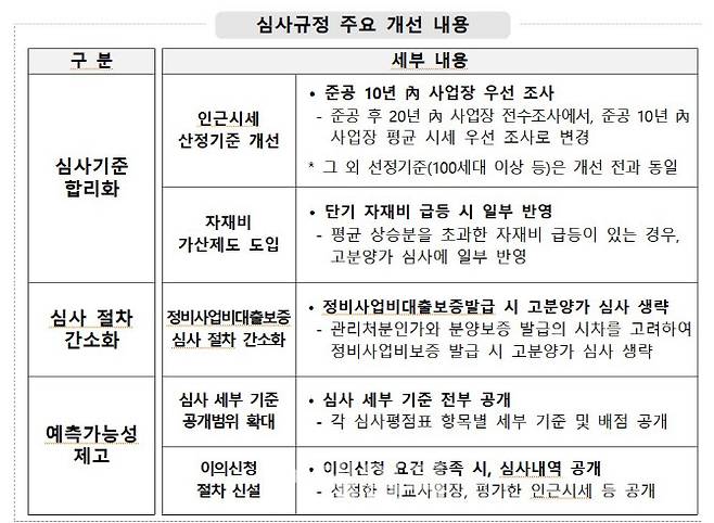 주요 개선 내용을 살펴보면 △인근 시세 산정기준 개선 및 자재비 가산제도 도입 △심사절차 간소화 △고분양가 심사평점표의 세부기준 전체공개 △이의신청을 통해 일부 심사정보 공개 등을 담고 있다.