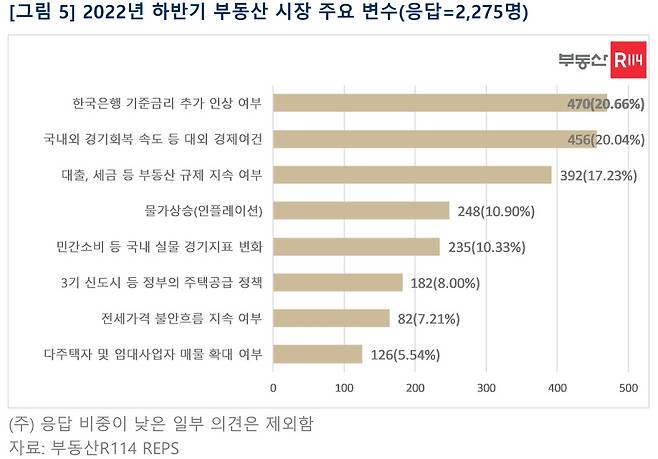 올해 하반기 주택 시장 핵심 변수로는 '한국은행 기준금리 추가 인상 여부'가 20.66%로 가장 높은 응답률을 기록했다. 이와 관련 윤 수석연구원은 "미국 기준금리 빅스텝과 한은의 꾸준한 금리인상으로 시중 주택담보대출 금리가 6~7%(상한선 기준) 수준까지 올라온 상황"이라며 "하반기 추가 금리인상이 예고된 상황으로 대출 이자상환 부담은 더 올라갈 전망"이라고 설명했다.