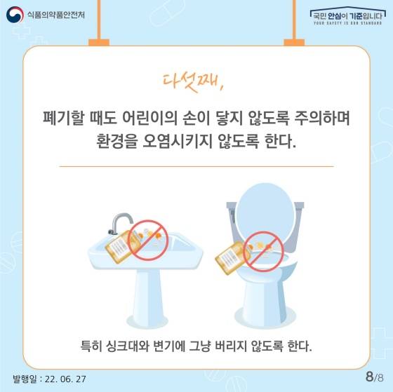 다섯째, 폐기할 때도 어린이의 손이 닿지 않도록 주의하며, 환경을 오염시키지 않도록 한다.