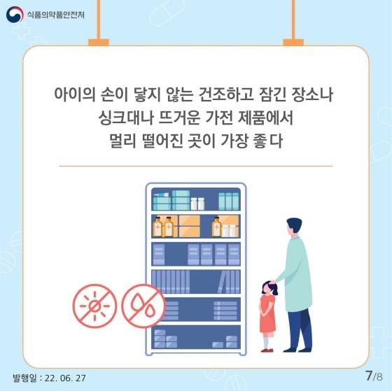 아이의 손이 닿지 않는 건조하고 잠긴 장소나 싱크대나 뜨거운 가전제품에서 멀리 떨어진 곳이 가장 좋다
