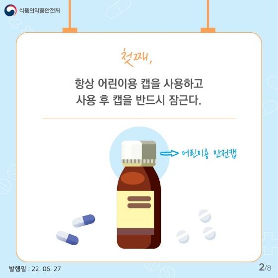 첫째, 항상 어린이용 캡을 사용하고 사용 후 캡을 반드시 잠근다.