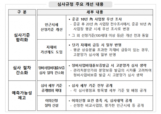 우선 인근시세 산정 시 준공 후 20년 이내 사업장을 일괄 선정하던 것에서, 준공 후 10년 이내 사업장을 우선 선정하는 것으로 개선한다. 준공시점 기준 이외에 다른 요건은 기존과 동일하게 적용된다.