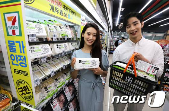 (서울=뉴스1) 이동해 기자 = 30일 오전 서울 종로구 세븐일레븐 종로재동점에서 모델들이 초저가 장보기 브랜드 '굿민' 론칭 기념 특가 상품들을 선보이고 있다. 안심달걀, 한입삼겹살, 대패삼겹살, 한끼두부, 안심콩나물 등으로 구성된 '굿민'은 대형마트 수준의 가격 경쟁력을 갖췄다. 2022.6.30/뉴스1