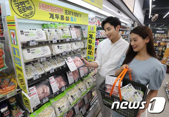 (서울=뉴스1) 이동해 기자 = 30일 오전 서울 종로구 세븐일레븐 종로재동점에서 모델들이 초저가 장보기 브랜드 '굿민' 론칭 기념 특가 상품들을 선보이고 있다. 안심달걀, 한입삼겹살, 대패삼겹살, 한끼두부, 안심콩나물 등으로 구성된 '굿민'은 대형마트 수준의 가격 경쟁력을 갖췄다. 2022.6.30/뉴스1