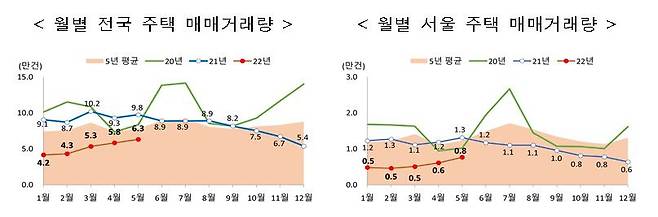 30일 국토교통부에 따르면 올 5월 주택 매매 거래량은 총 6만3200만건으로 전월(5만8407건) 대비 8.2% 증가했다. 지난해 같은 기간(9만7524건)과 5년 평균(7만8191건) 대비 각각 35.2%, 19.2% 감소했다. 올 5월 누적으로는 25만9956건의 매매 거래가 성사됐는데, 지난해 같은 기간(47만401건)보다 44.7% 감소하고 5년 평균(38만8809건)에 비해 33.1% 감소한 수준이다.