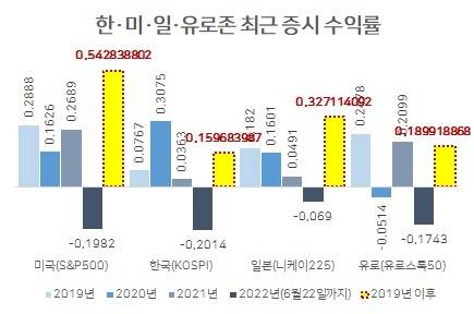 과거 엔화 약세 구간에서 일본 기업들은 매출과 이익 모두 높은 성장률을 보였다. 이는 최근 증시에서도 확인된다. 2019~2020년 니케이225 상승폭은 코스피와 유로스톡50을 앞선다. 지난해에도 우리 보다 더 올랐다. 올해 하락폭은 코스피나 S&P500의 3분의 1에 불과하다.