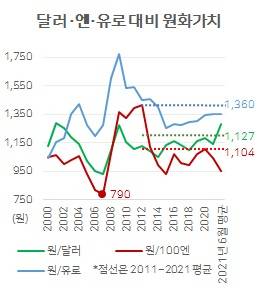 지난 9일 서울 외환시장에서 100엔 가치는 935원까지 하락했다. 지난10년(2011~2021년) 동안 환율 평균은 원/달러 1127원, 원/엔 1104원, 원/유로 1360원이다. 6월 평균 환율은 원/달러 1279원, 원/엔 954원, 원/유로 1351원이다. 원화는 10년 평균과 비교해 달러와 유로 대비로는 12%, 0.7% 가량 가치가 낮지만 엔 보다는 16% 가까이 높은 상황이다. 평균으로 회복된다고 전제하면 지금 엔화를 사면 16% 가량 수익이 날 수 있다는 뜻이다. 관건은 엔화 가치 회복 가능성이다.