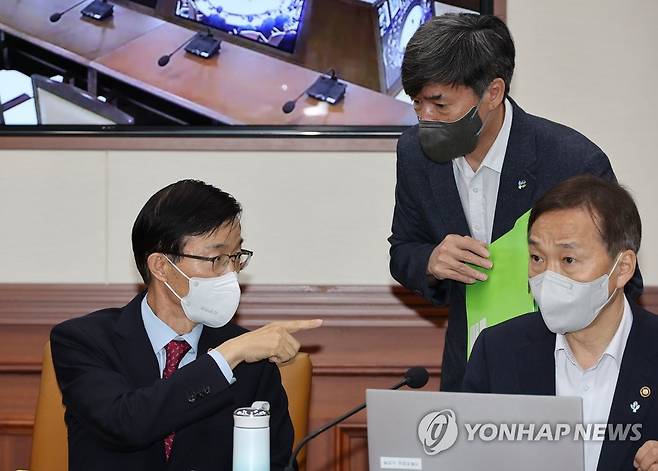 (서울=연합뉴스) 김승두 기자 = 방문규 국무조정실장(왼쪽)이 30일 정부서울청사에서 열린 총리 주재 국정현안점검조정회의에 참석해 박구연 국무1차장과 대화하고 있다. 2022.6.30
