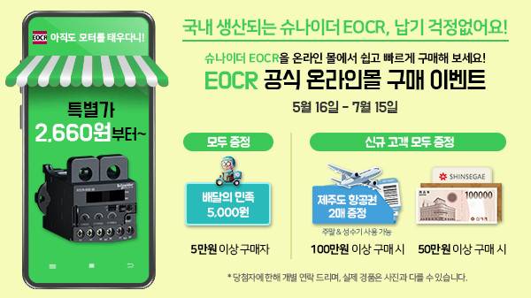 한편 슈나이더 일렉트릭 코리아는 7월 15일까지 공식 온라인 몰 6곳에서 EOCR을 구매하는 신규 및 기존 고객 전원을 대상으로 구매 금액에 따라 차등 적용해 풍성한 선물을 제공한다.