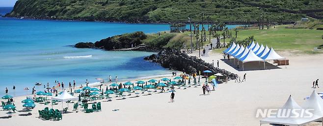 [제주=뉴시스] 우장호 기자 = 장마전선이 북상하며 무더운 날씨를 보이는 30일 오전 제주시 조천읍 함덕해수욕장을 찾은 관광객들이 물놀이를 하며 즐거운 시간을 보내고 있다. 이호와 협재, 함덕 등 제주 도내 12개 해수욕장은 7월1일 일제히 문을 열고 피서객을 맞이 한다. 2022.06.30. woo1223@newsis.com