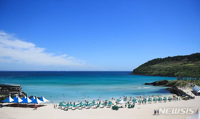 [제주=뉴시스] 우장호 기자 = 장마전선이 북상하며 무더운 날씨를 보이는 30일 오전 제주시 조천읍 함덕해수욕장을 찾은 관광객들이 물놀이를 하며 즐거운 시간을 보내고 있다. 이호와 협재, 함덕 등 제주 도내 12개 해수욕장은 7월1일 일제히 문을 열고 피서객을 맞이 한다. 2022.06.30. woo1223@newsis.com