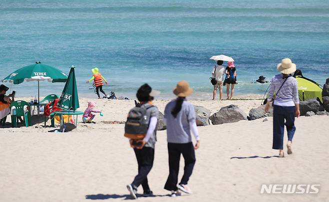 [제주=뉴시스] 우장호 기자 = 장마전선이 북상하며 무더운 날씨를 보이는 30일 오전 제주시 조천읍 함덕해수욕장을 찾은 관광객들이 물놀이를 하며 즐거운 시간을 보내고 있다. 이호와 협재, 함덕 등 제주 도내 12개 해수욕장은 7월1일 일제히 문을 열고 피서객을 맞이 한다. 2022.06.30. woo1223@newsis.com