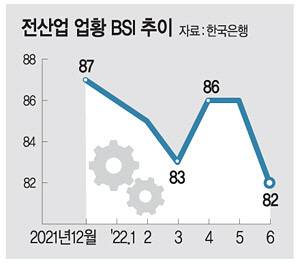 한국은행이 30일 전국 3255개 법인기업(응답기업 2800개)을 대상으로 조사해 발표한 6월 기업경기실사지수(BSI)에 따르면 이달 모든 산업의 업황 실적 BSI는 지난달보다 4포인트 내린 82로 집계됐다. 4월과 5월엔 86으로 유지됐지만, 다시 떨어졌다. 우크라이나 전쟁 장기화에 따른 원자재 및 물류 가격 부담 가중, 물가 상승세 지속, 주요국 금리 인상에 따른 경기 둔화 우려 등이 영향을 미친 것으로 분석된다. BSI는 현재 경영상황에 대한 기업의 판단과 전망을 조사한 통계로 100 미만이면 부정적인 답변이 긍정적인 답변보다 많다는 것을 의미한다.
