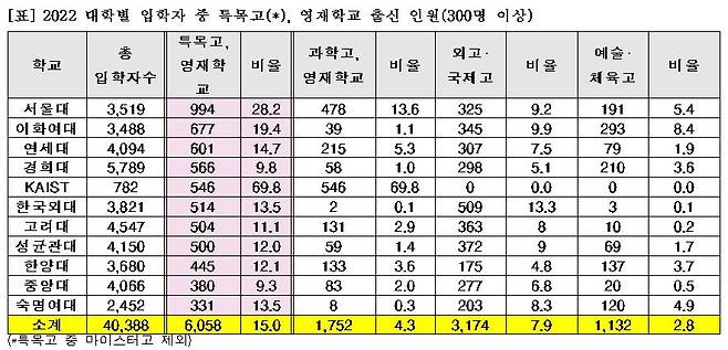전체 대학(4년제 대학, 교육대 등) 입학자 33만7천53명 가운데 영재·특목고 출신은 1만4천804명(4.4%)이다.