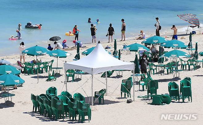 [제주=뉴시스] 우장호 기자 = 장마전선이 북상하며 무더운 날씨를 보이는 30일 오전 제주시 조천읍 함덕해수욕장에서 개장 준비가 한창이다. 이호와 협재, 함덕 등 제주 도내 12개 해수욕장은 7월1일 일제히 문을 열고 피서객을 맞이 한다. 2022.06.30. woo1223@newsis.com