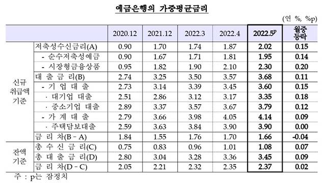 한국은행이 오늘(30일) 공개한 5월 금융기관 가중평균금리 자료를 보면 예금은행의 신규취급액 기준 전체 대출금리는 3.68%로 전 달보다 0.11%p 올랐습니다.
