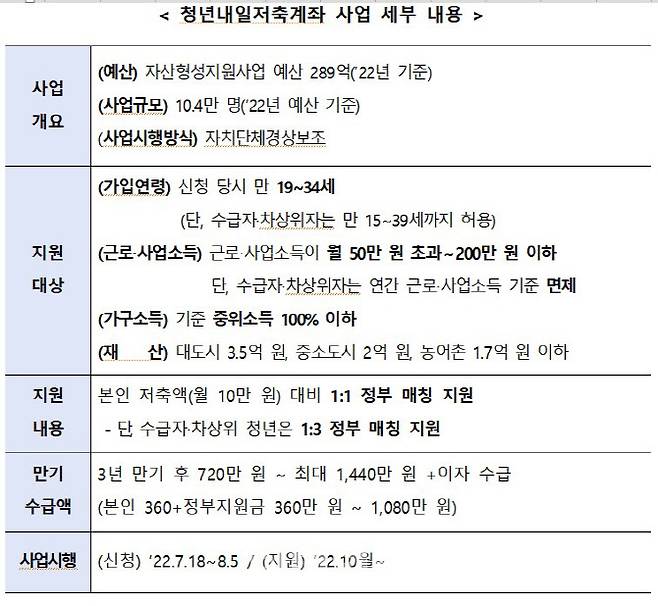 한편, 기초생활수급자 및 차상위(기준 중위소득 50% 이하) 청년은 추가적 지원 필요성에 따라 만 15~39세까지 가입 연령을 확대하고 근로·사업소득 기준(월 50만~200만원)을 적용하지 않을 예정이다.