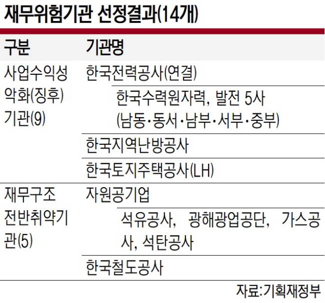 기재부가 내놓은 14개 재무위험 기관은 한국전력공사(연결 기준), 한국수력원자력, 남동·동서·남부·서부·중부 등 발전 5사, 한국지역난방공사, 한국토지주택공사(LH) 등 사업수익성 악화(징후) 기관 9개, 석유공사, 광해광업공단, 가스공사, 석탄공사 등 5개 자원 공기업과 한국철도공사(코레일) 등 재무구조 전반 취약기관 5개 등 모두 14개다. 재무상황평가 대상 기관은 중장기재무관리계획 작성 기관 39개 중에서 금융·기금형 기관을 제외한 27개 기관이다. 기재부는 재무 지표 16점, 재무 성과 4점 등 총 20점 만점으로 재무상황을 평가했다. 평가 결과, 전체 27개 대상기관 평균점수는 13.5점(20점 만점)이며 14개 재무위험기관 평균점수는 8.7점으로 전체 평균대비 4점 이상 저조하고, 재무위험기관으로 선정되지 않은 기관들과 비교하면 8점 이상 낮았다. 특히 14개 재무위험기관의 부채 및 자산규모는 전체 350개 공공기관 부채·자산의 절반 이상을 차지하고 있어서 재무위험기관의 재무 악화는 향후 전체 공공기관의 부채비율 증가·부실로 연결될 우려가 크다는 전망이 나온다.
