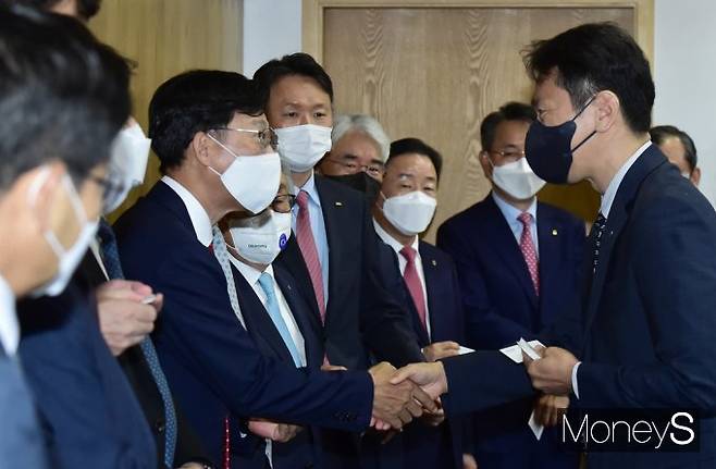 이복현 금감원장(오른쪽)이 30일 서울 종로구 도렴동 생명보험교육문화센터에서 열린 금융감독원-보험사 CEO 간담회에 참석, 인사를 나누고 있다.