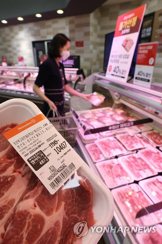 (서울=연합뉴스) 강민지 기자 = 수입돈육에 할당관세가 적용됨에 따라 대형마트에서 캐나다산 수입돈육 가격을 인하해 판매한다. 홈플러스는 내달 6일까지 마이홈플러스 멤버십 회원 대상으로 캐나다산 냉장 삼겹살과 목심, 항정살을 최대 40% 싸게 판매한다. 사진은 30일 서울의 한 홈플러스에 진열된 수입산 돼지고기 2022.6.30