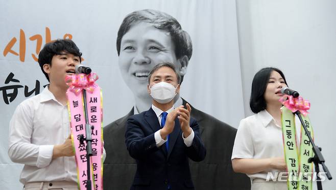 [전주=뉴시스] 김얼 기자 = 김승수 전주시장이 30일 전북 전주시 전주시청 공연장에서 열린 퇴임식에 참석해 전주시청 직원들의 축가를 들으며 박수치고 있다. 2022.06.30. pmkeul@newsis.com
