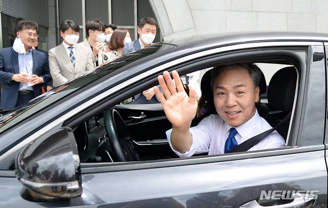 [전주=뉴시스] 김얼 기자 = 김승수 전주시장이 30일 전북 전주시 전주시청 공연장에서 열린 퇴임식을 마치고 취재진에게 인사를 하고 있다. 2022.06.30. pmkeul@newsis.com