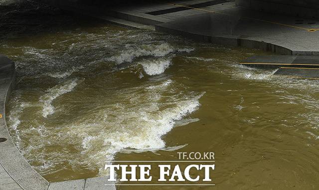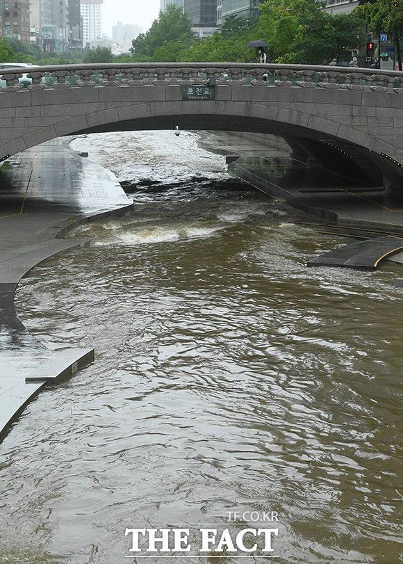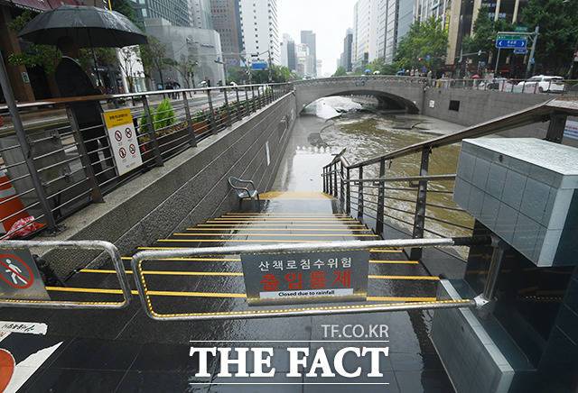 [더팩트ㅣ이동률 기자] 서울 전역에 호우경보가 발효된 30일 오전 서울 중구 청계천이 물에 잠겨 출입이 통제되고 있다.