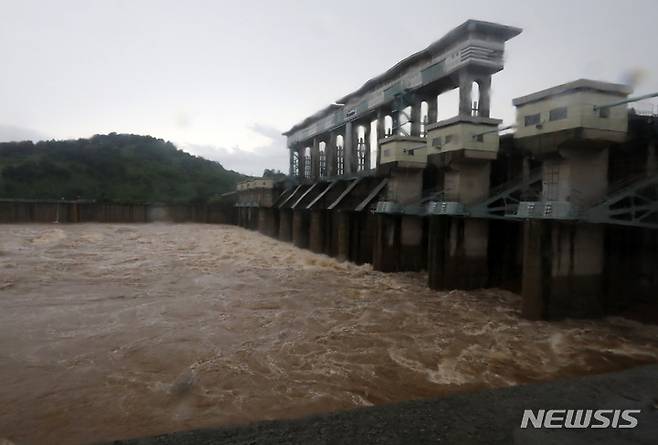 [연천=뉴시스] 배훈식 기자 = 전국 곳곳에 호우주의보와 홍수주의보가 내려진 30일 오후 경기 연천군 군남홍수조절댐에서 임진강 수위 조절을 위한 많은 물이 쏟아지고 있다. 2022.06.30. dahora83@newsis.com