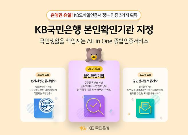 은행권에서 처음으로 자체 개발해 선보인 KB국민은행의 'KB모바일인증서'가 사업 2년 만에 본궤도에 오를 수 있게 됐다. 전자서명인증사업자, 공인전자문서중계자에 이어 본인확인기관 지정까지 획득함에 따라 국민생활 영역에서 널리 쓰이는 종합인증서비스로 도약하는데 속도를 낸다.