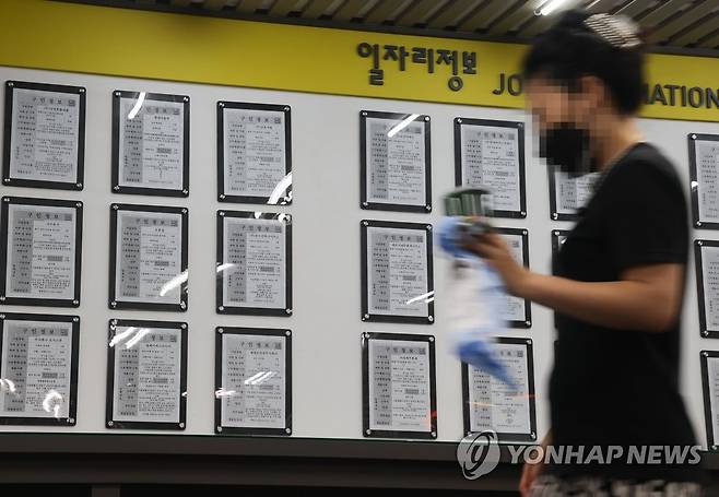 (서울=연합뉴스) 류효림 기자 = 내년도 최저임금이 올해보다 5.0% 오른 시간당 9천620원으로 정해졌다. 최저임금을 심의·의결하는 사회적 대화 기구인 최저임금위원회는 지난 29일 정부세종청사에서 제8차 전원회의를 열어 내년도 최저임금을 9천620원으로 의결했다.이는 올해 최저임금(9천160원)보다 460원(5.0%) 높은 금액이다. 내년도 최저임금의 월 환산액(월 노동시간 209시간 기준)은 201만580원이다. 사진은 30일 서울 마포구 서부고용복지플러스센터에 일자리정보 게시판 모습. 2022.6.30