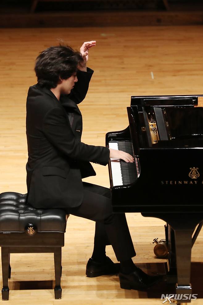 [서울=뉴시스] 박진희 기자 = 피아니스트 임윤찬이 30일 서울 서초구 한예종 서초동캠퍼스 이강숙홀에서 기자간담회에 앞서 연주를 하고 있다. 임윤찬은 지난 18일 미국 반 클라이번 국제 피아노 콩쿠르에서 역사상 최연소로 우승했다. 2022.06.30. pak7130@newsis.com