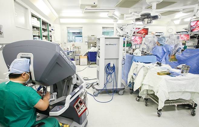 [김용희 서울아산병원 식도암센터장(왼쪽 아래)의 식도암 로봇 수술(제공: 서울아산병원)]
