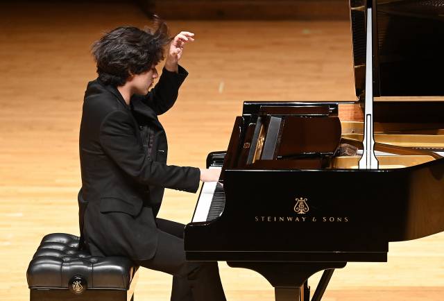 반 클라이번 콩쿠르 우승을 차지한 피아니스트 임윤찬이 30일 서울 서초구 한국예술종합학교 서초캠퍼스 이강숙홀에서 기자간담회를 하기 전 피아노 연주를 선보이고 있다./오승현 기자 2022.06.30