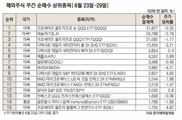 30일 예탁결제원에 따르면 이달 23일부터 29일까지 국내 서학개미들이 가장 많이 사들인 해외 주식은 나스닥 하락장에 베팅하는 '프로셰어즈 울트라프로 숏 QQQ ETF(SQQQ)'였다. 숏은 시세 하락에 베팅하는 투자 방식을 말한다. SQQQ는 3배 레버리지 상품이다. 나스닥지수가 1% 하락하면 SQQQ는 3% 상승한다. 서학개미들은 SQQQ를 3억 1827만 달러(약 4137억 5100만 원)어치 순매수했다.