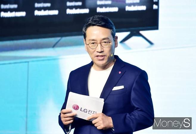 LG전자와 SM엔터테인먼트가 손잡고 홈 피트니스 서비스인 합작법인 '피트니스캔디(Fitness Candy)'를 출범한 가운데 30일 서울 영등포구 여의도동 콘래드 서울에서 열린 출범식에 조주완 LG전자 사장이 프레젠테이션을 하고 있다.