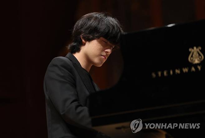 (서울=연합뉴스) 신준희 기자 = 18살의 나이로 미국 반 클라이번 콩쿠르에서 최연소 우승 기록을 세운 피아니스트 임윤찬이 30일 한예종 서초캠퍼스에서 열린 기자간담회에서 연주를 선보이고 있다. 2022.6.30