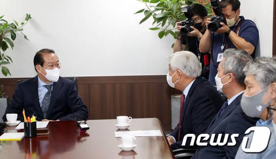 (서울=뉴스1) 김명섭 기자 = 권영세 통일부 장관이 30일 서울 종로구 세종대로 통일부에서 방인성 대북협력민간단체협의회(북민협) 회장등과 면담을 하고 있다. 2022.6.30/뉴스1