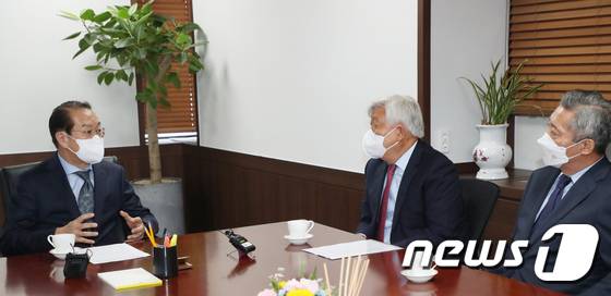 (서울=뉴스1) 김명섭 기자 = 권영세 통일부 장관이 30일 서울 종로구 세종대로 통일부에서 방인성 대북협력민간단체협의회(북민협) 회장등과 면담을 하고 있다. 2022.6.30/뉴스1