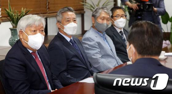 (서울=뉴스1) 김명섭 기자 = 방인성 대북협력민간단체협의회(북민협) 회장이 30일 서울 종로구 세종대로 통일부에서 권영세 통일부 장관과 면담을 하고 있다. 2022.6.30/뉴스1