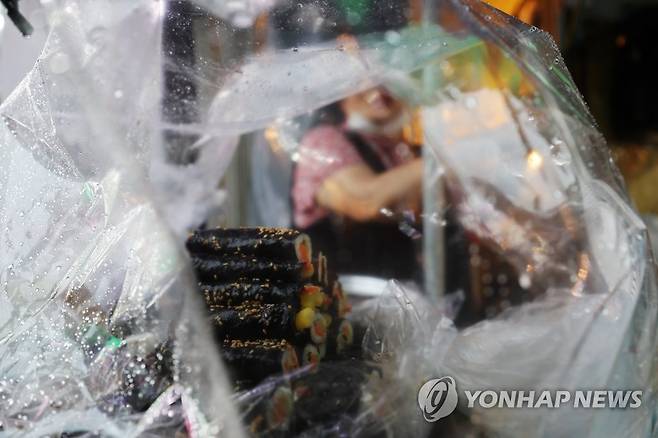 (서울=연합뉴스) 박동주 기자 = 장맛비가 계속된 30일 서울 남대문 시장에서 한 상인이 김밥을 팔고 있다.