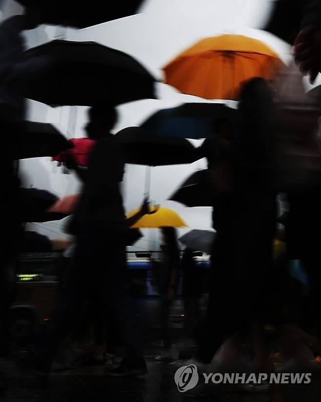 (서울=연합뉴스) 박동주 기자 = 장맛비가 계속된 30일 우산을 쓴 시민들이 서울 광화문 사거리를 지나고 있다.
