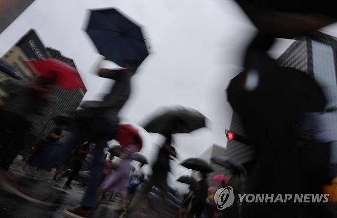 (서울=연합뉴스) 박동주 기자 = 장맛비가 계속된 30일 우산을 쓴 시민들이 서울 광화문 사거리를 지나고 있다.