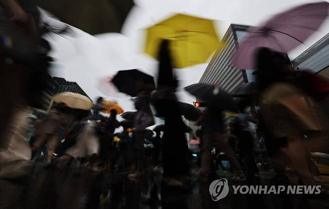 (서울=연합뉴스) 박동주 기자 = 장맛비가 계속된 30일 우산을 쓴 시민들이 서울 광화문 사거리를 지나고 있다.