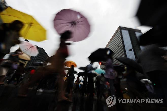 (서울=연합뉴스) 박동주 기자 = 장맛비가 계속된 30일 우산을 쓴 시민들이 서울 광화문 사거리를 지나고 있다.