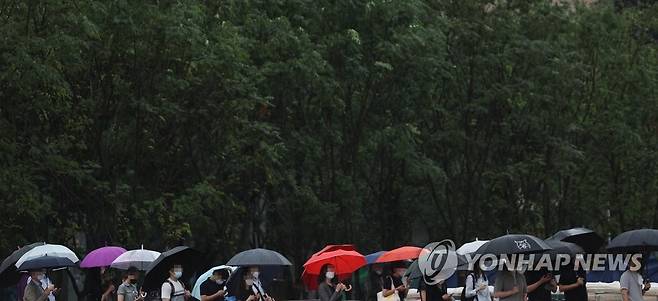 (서울=연합뉴스) 박동주 기자 = 장맛비가 계속된 30일 우산을 쓴 시민들이 서울 광화문 사거리에서 신호를 기다리고 있다.