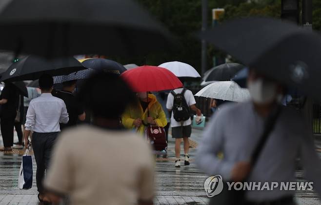 (서울=연합뉴스) 박동주 기자 = 장맛비가 계속된 30일 우산을 쓴 시민들이 서울 광화문 사거리를 지나고 있다.