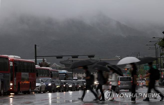 (서울=연합뉴스) 박동주 기자 = 장맛비가 계속된 30일 우산을 쓴 시민들이 서울 광화문 사거리를 지나고 있다.
